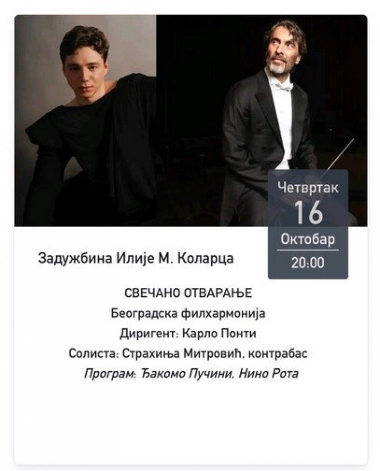 16. oktobar, Kolarac – Otvaranje: Beogradska filharmonija, dirigent Karlo Ponti, solista Strahinja Mitrović (Pučini, Rota)
