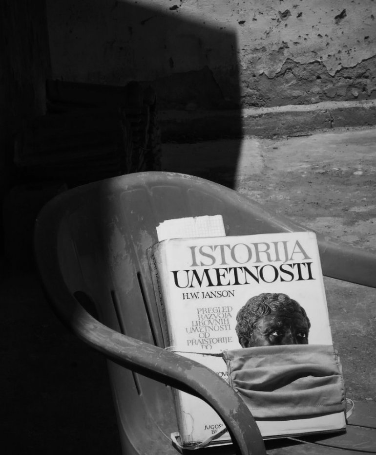 Nezaoblazna Jansonova Istorija umetnosti "ovenčana" je, za potrebe ovog "poziranja" na zadatu temu, jednako nezaobilaznom rekvizitom za ovo pandemijsko doba - maskom!