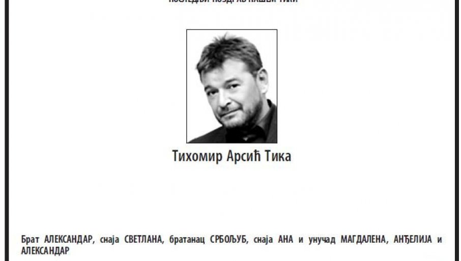 SRPSKI glumac Tihomir Tika Arsić preminuo je u ponedeljak u 64. godini nakon duge i teške bolesti.