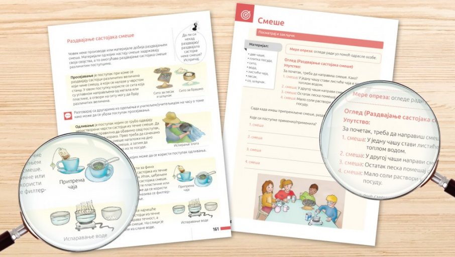 Da bi se učenici upoznali sa nekim postupcima razdvajanja sastojaka smeše i shvatili da čovek neke proizvode i materijale dobija razdvajanjem smeša, mogu izvesti jednostavan ogled, samostalno ili timski, sa svojim roditeljima.
