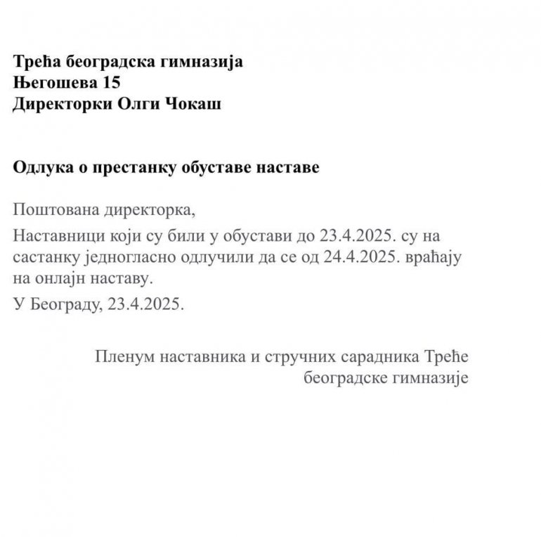 NASTAVNICI Treće beogradske gimnazije koji su do 23.04.2025. bili u obustavi vraćaju se na onlajn nastavu.