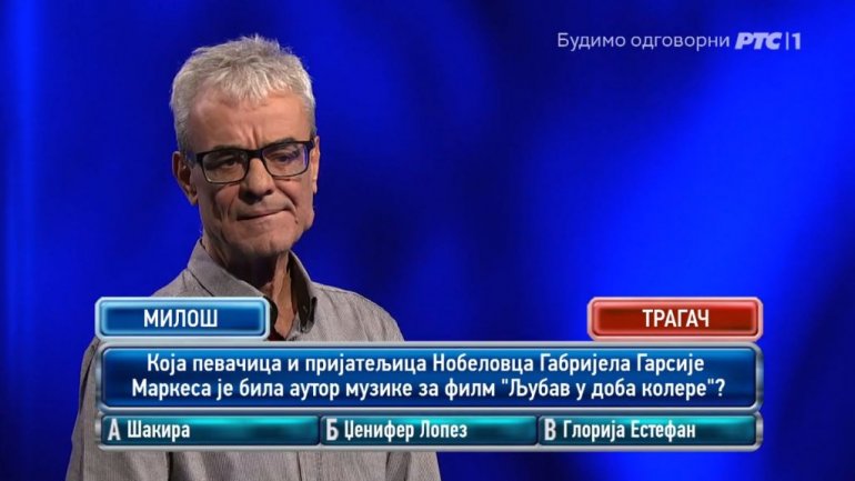 - Koja pevačica i prijateljica nobelovca Gabrijela Garsije Markesa je bila autor muzike za film "Ljubav u doba kolere"? - glasilo je pitanje, dok su ponuđeni odgovori bili Šakira, Dženifer Lopez i Glorija Estefan.