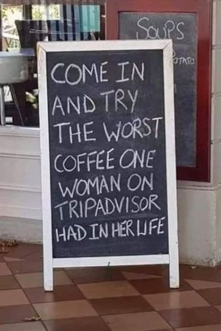 Fotografija sa tablom na kojoj piše "Uđite i probajte najgoru kafu koju je jedna žena na Tripadvisor-u pila u životu" nasmejala je goste.