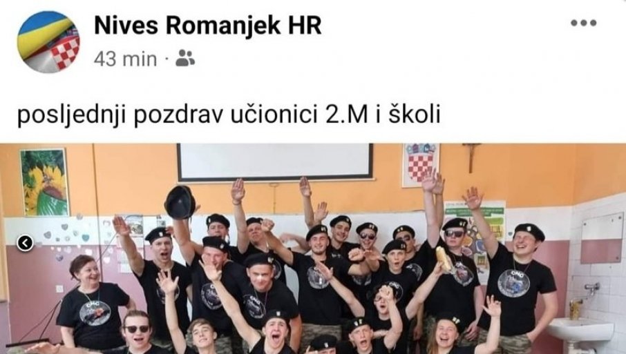 PROFESORKA hrvatskog jezika u Industrijsko-zanatskoj školi u Slavonskom Brodu objavila je na svom "Fejsbuk" profilu fotografiju maturanata koji sa beretkama na glavi drže desnice u vazduhu u znaku nacističkog pozdrava, prenosi portal "Indeks".