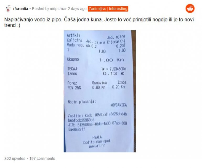 - Naplaćivanje vode iz česme. Čaša jedna kuna. Jeste li to već primetili negde ili je to novi trend - napisao je on na Reditu.
