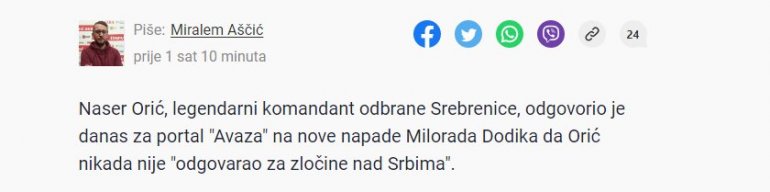 U tekstu koji potpisuje Miralem Aščić, za Nasera Orića piše da je "legendarni komandant odbrane Srebrenice".