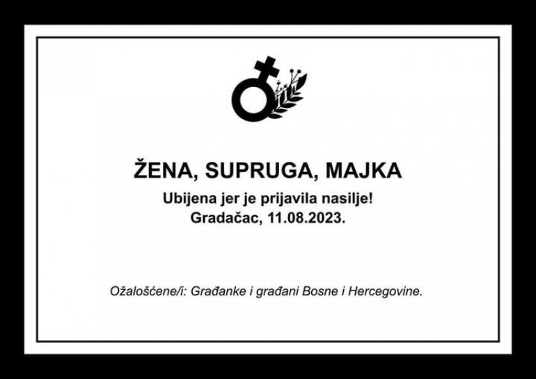 Društvenim mrežama se širi fotografija sa potresnim rečima, na kojoj se navodi: "Žena, supruga, majka. Ubijena jer je prijavila nasilje", uz današnji datum koji je BiH zavio u crno.