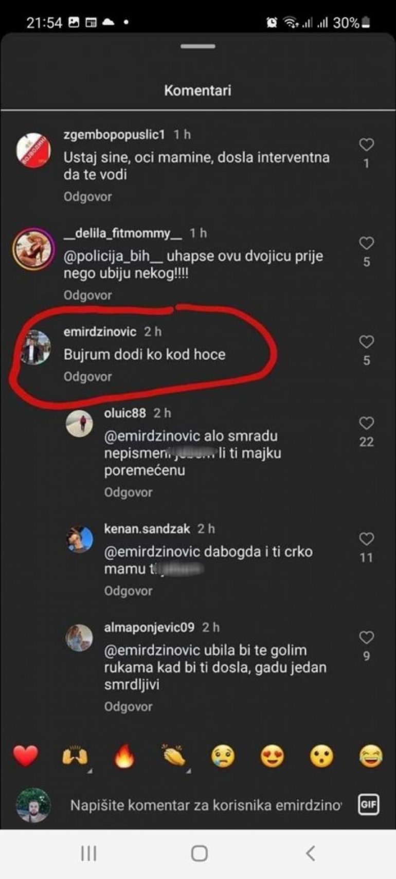 Kako Indeks prenosi, on se navodno javljao i u komentarima tokom ubičinog prenosa uživo na Instagramu. Napisao je: "Bujrum, dođi ko god hoće."