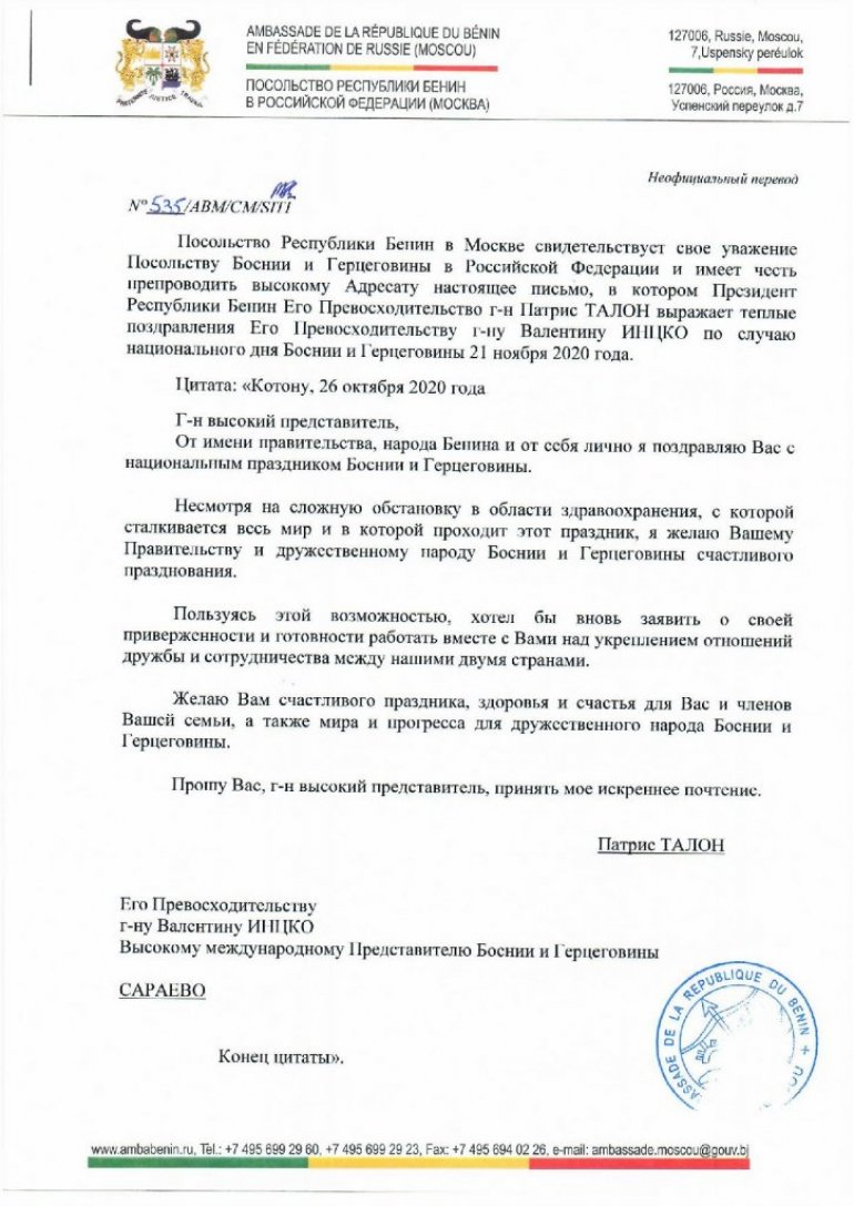 Umesto članovima Predsedništva BiH čestitku protektoru Austrijancu, a umesto 25. novembra, čestita se 21. novembar. U Čestitci se kaže da ambasada Republike Benin u Moskvi u ime predsenika prenesi pismo u kome predsednik republike Benin Patris Talon, izražava tople pozdrave njegovoj ekselenciji gospodinu Valentinu Insku, povodom Nacionalnog dana BiH 21. novembra 2020.