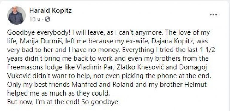 - Zbogom svima. Napuštam vas jer ne mogu više. Ljubav mog života ostavila me jer je moja bivša žena bila vrlo loša prema njoj, ali i jer nemam više novca. Sve što sam pokušavao da radim poslednjih godinu i po nije uspevalo. Čak ni moja braća iz masonske lože nisu htela da mi pomognu, na kraju nisu ni odgovarali na moje telefonske pozive. Samo moji najbolji prijatelji i moj brat su mi pomagali koliko su mogli. Ali sad, sad je kraj! Zato zbogom – napisao je.