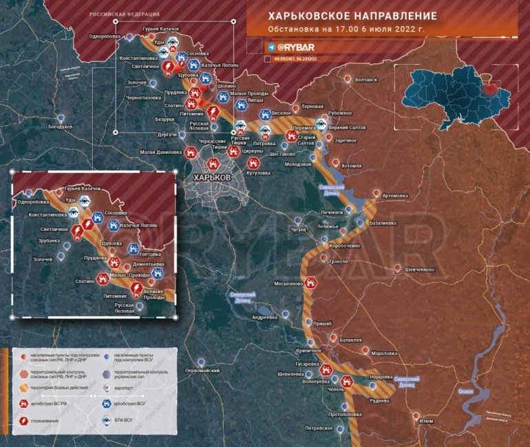 * Prema rezultatima rada posada bespilotnih letelica, izvršeni su artiljerijski i vazdušni udari (najmanje 6 aviona MiG-29 i Su-25 sa aerodroma Mirgorod) na položaje Oružanih snaga RF u rejonima Kazačja. Lopan, Liptsi, Maliie Prokhodi, Goptovka, Veseloe, Sosnovka.
