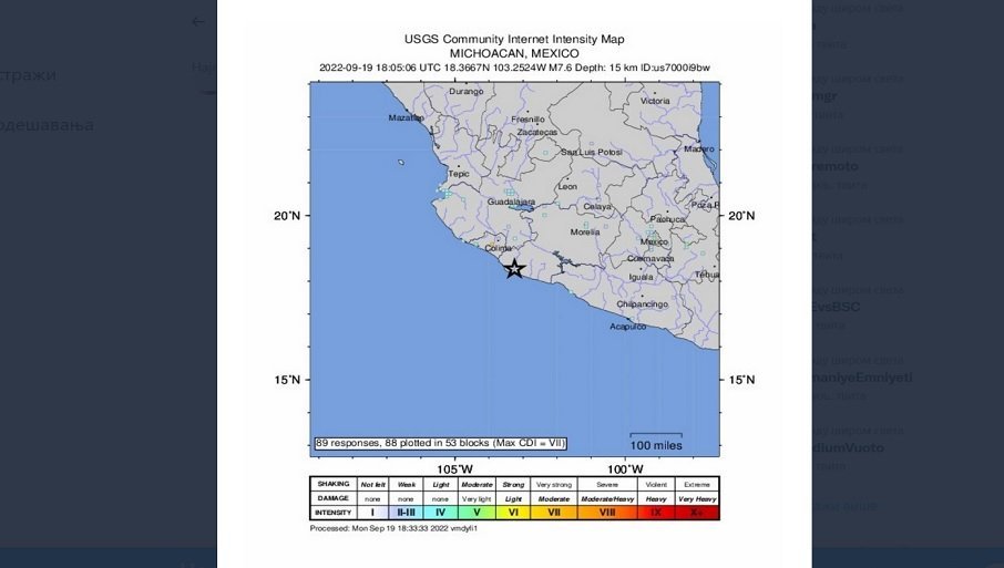 USGS navodi da je epicentar zemljotresa zabeležen na dubini od 15 kilometara u meksičkoj državi Mičokan.