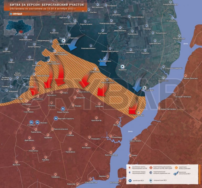 Na severoistoku Hersonske oblasti pregrupisale su se Oružane snage RF. Zbog proboja Oružanih snaga Ukrajine na Berislavskom sektoru i pretnje fizičkog opkoljavanja ruske grupe iz sela Dudčani i Davidov Brod, doneta je odluka o povlačenju kontingenta Oružanih snaga RF u novu linija odbrane.