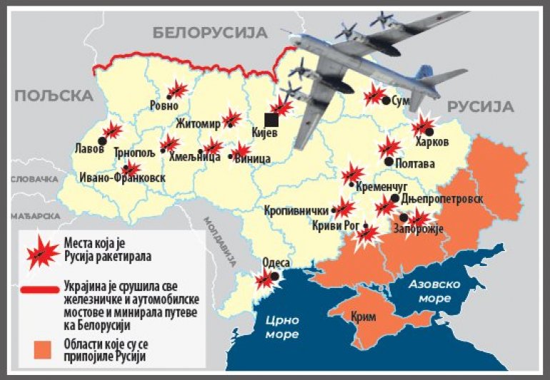 RUSIJA je u napadima na Ukrajinu upotrebila rakete X-101, X-555, "kalibar" i "iskander", kao i sisteme S-300 i višecevne bacače raketa "tornado-S", saopštila je komanda Vazduhoplovstva Oružanih snaga Ukrajine. Navedeno je da su ruske snage napale gradove Ukrajine iz svih pravaca, raketama raznih tipova, posebno iz Crnog mora i Kaspijskog regiona. Dodaje se da ruske snage koriste visokoprecizne krstareće rakete sa kopna, mora i iz vazduha i da se rakete X-101 i X-555 lansiraju iz Kaspijskog regiona iz 11 strateških bombardera "tu-95" i "tu-160", a krstareće rakete "kalibar" sa brodova u Crnom moru.