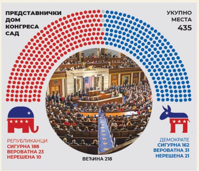 - Prognoze već duže vremena govore da će republikanci da preuzmu većinu u donjem domu Kongresa, kao i da osvoje većinu u Senatu. Prednost koju su uživali demokrate se "istopila" u Nju Hempširu za Senat, gde republikanac napreduje, a konzervativcima je potrebno samo jedno mesto da osvoje gornji dom na Kapitol hilu. U Ohaju, Pensilvaniji, Džordžiji, Arizoni republikanci su ili pretekli demokrate, ili ih prate u procenat, ili dva. I na izborima za guvernere vidimo napredak republikanaca, čak i u državama gde je to malo ko očekivao. Nigde demokrate nisu toliko sigurne kao što su nekad bile, pa čak ni u njihovom tradicionalnom uporištu, Kaliforniji, gde takođe republikanci imaju blagu prednost. Svi su izgledi da će se ostvariti prognoze o "crvenom talasu" - ocenjuje za "Novosti" Obrad Kesić, politički analitičar iz Vašingtona.