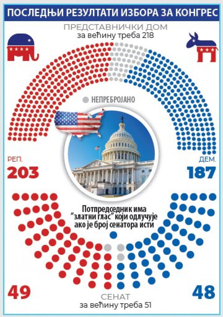 No, neizvesnost je velika, pa su sve oči posebno su uprte u četiri glavne države, koje mogu da donesu većinu u Senatu - u Džordžiju, Arizonu, Nevadu i Viskonsin. Ali, zborne komisije širom SAD još verifikuju glasove i, baš kao što se to dogodilo na prošlim izborima 2020. godine, na konačne rezultate može se čekati danima, čak nedeljama.