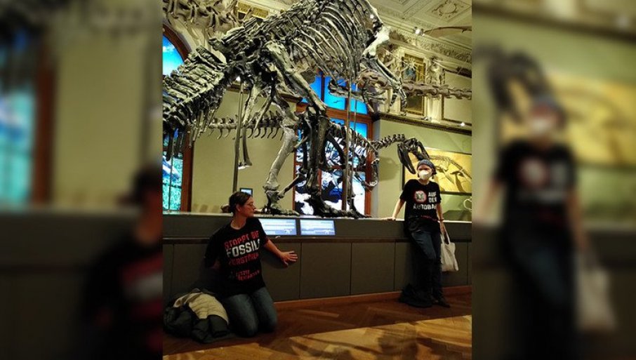 DVOJICA eko-terorista zalepili su se za izložbu dinosaurusa u Prirodnjačkom muzeju u austrijskoj prestonici u četvrtak u znak protesta protiv fosilnih goriva. Skelet nije pretrpeo nikakva oštećenja, a akrobaciju je ubrzo prekinula policija.