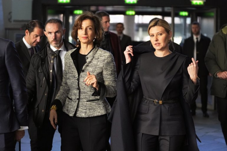 PRVA dama francuske Brižit Makron ugostila je juče suprugu predsednika Ukrajine Olenu Zelensku. Dočekala je na vratima Jelisejske palate. Ovo je prva poseta Zelenske Francuskoj od izbijanja rata u Ukrajini. Dve prve dame su se već videle u septembru na marginama Generalne skupštine UN u Njujorku. Osim razgovora o izbeglicama, bilo je planirano i da zajedno posete školu.  Prva dama Ukrajine sastala se i sa direktorkom Uneska Odri Azulaj (na slici).
