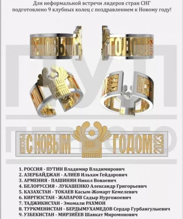 LIDERI zemalja Zajednice nezavisnih država (ZND), koji su stigli na neformalni samit u Sankt Peterburg, dobili su novogodišnji poklon – prsten sa obeležjem ZND, saopštio je Telegram kanal „Pul prvog“ blizak lideru Belorusije.
