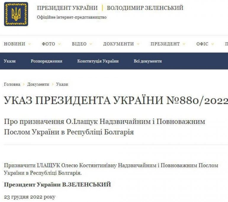 Vladimir Zelenski je Ukaz o postavljanju hipnotizera seksologa Olesije Ivanščuk za ambasadora potpisao 23. decembra. Kijev je tom prilikom saopštio da "imenovanje dolazi u važnom trenutku u odnosima između Bugarske i Ukrajine".