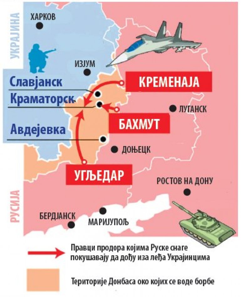 Sa fronta u Donbasu i dalje stižu sasvim suprotne informacije iz Kijeva i Moskve. Rusi tvrde da polako napreduju na celoj dužini fronta i da imaju minimalan broj žrtava, jer njihova vojska kreće tek kad artiljerija i avijacija unište protivničke položaje. Na drugoj strani, u Kijevu kažu kako su uništili celu brigadu ruske morske pešadije kod Bahmuta, kako zovu Artjomovsk. Nesporno je da je taj grad sada ruska vojska opkolila sa svih strana i artiljerija i avijacija u talasima gađa ukrajinske položaje. Zapadni mediji pišu da ukrajinskoj vojsci ponestaju artiljerijske granate i pešadijska municija. Cilj ruske vojske je da dođe iza leđa braniocima Slavjanska, Kramatorska i Avdejevke, jer su njihovi rovovi i utvrđenja okrenuti ka istoku.