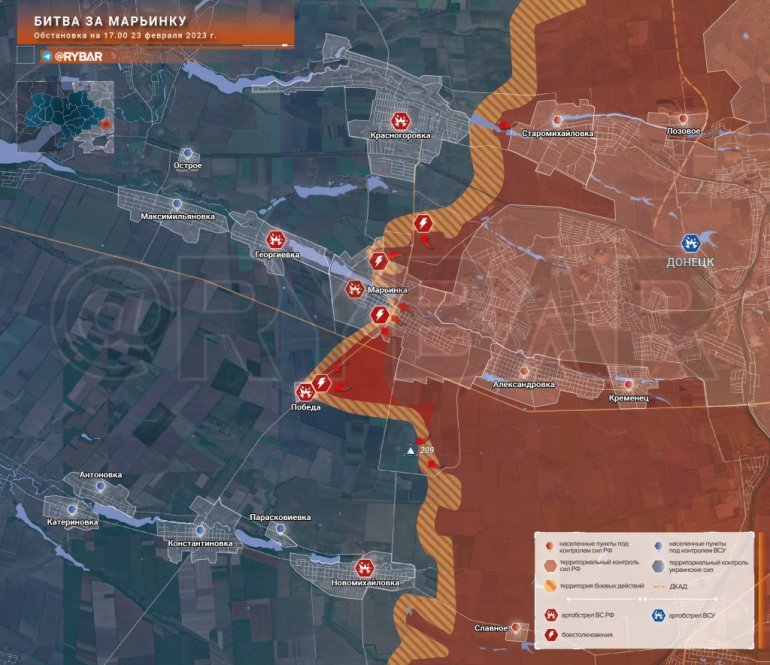 Nastavljaju se pozicione borbe u centru grada na Marjinki. Zbog složenosti juriša, Oružane snage RF pokušavaju da pokriju grad sa juga i severa.