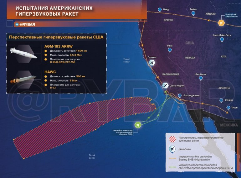 NA pacifičkoj obali Sjedinjenih Država kod obale Kalifornije, duž standardne rute zapadnog raketnog poligona Vandenberg, od 13. do 14. marta, vojska SAD izvršila je još jedan test raketnog naoružanja, najverovatnije, hipersonično krstarenje AGM-183 ARRW raketa (ALCM).