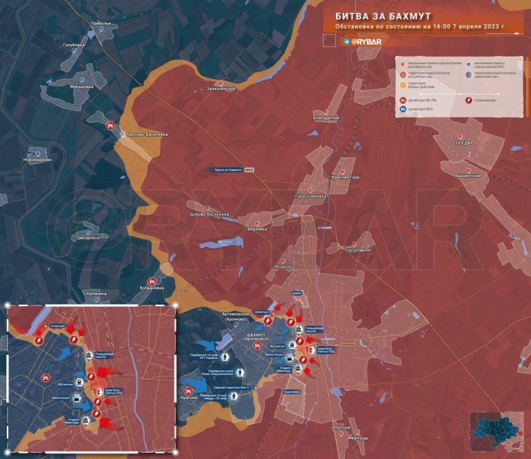 Sada ukrajinske formacije pokušavaju da izvrše kontranapad u različitim oblastima, zadržavajući jedinice PMC-a. Na zapadnoj periferiji Bahmuta raspoređeni su 14. odvojena jurišna „Krasnokalinskaja” brigada Nacionalne garde i puk patrolne policijske službe „Kijev” specijalnih snaga Ukrajine.