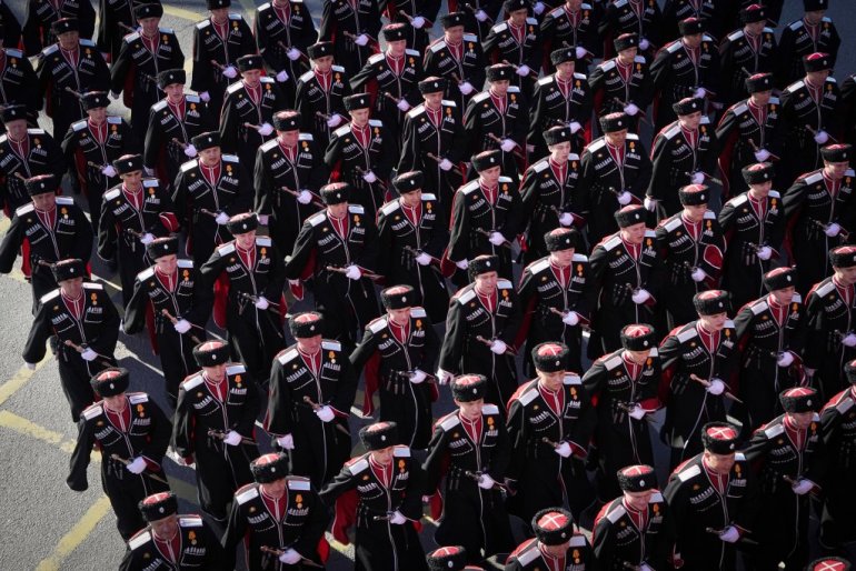 Paradom komanduje glavnokomandujući kopnene vojske general-pukovnik Oleg Saljukov. Oni prolaze ispred trupa u kabrioletima ruske proizvodnje „Aurus“.