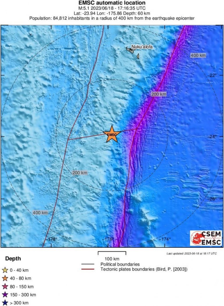 ZEMLjOTRES jačine 5,1 stepeni Rihterove skale pogodio je danas ostrvsku državu Tonga u Velikom tihom okeanu, saopštio je Evropski mediteranski seizmološki centar (EMSC).