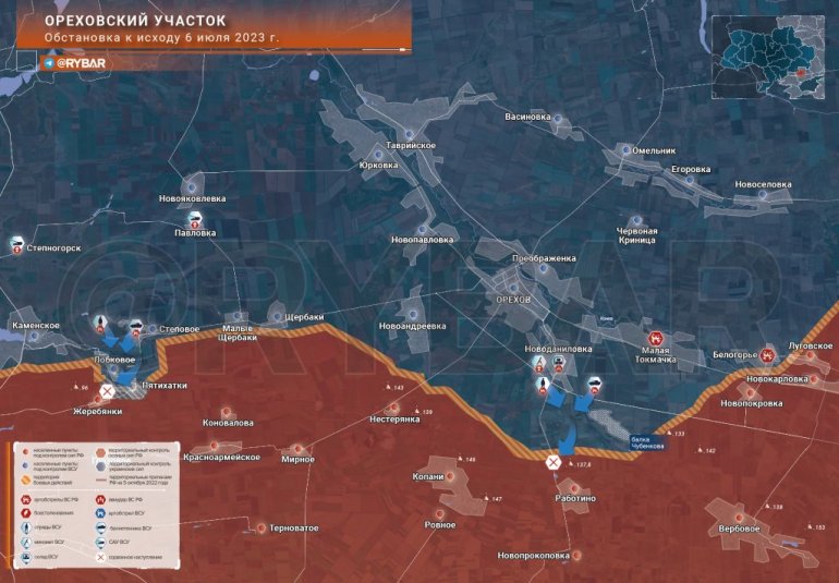 U pravcu Zaporožja, VSU nije prestao da napada u malim grupama na selo Žerebjanki. Jedinice Oružanih snaga RF samouvereno drže liniju, sprečavajući Oružane snage Ukrajine da napreduju na sektoru. U rejonu Rabotina, napadi ukrajinskih formacija takođe nisu imali uspeha.