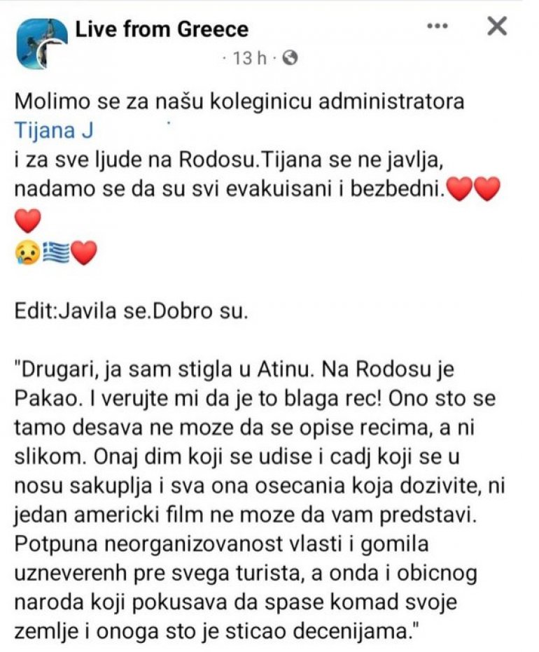 - Drugari, ja sam stigla u Atinu. Na Rodosu je pakao. I verujte mi da je to blaga reč! Ono što se tamo dešava ne može da se opiše rečima, a ni slikom. Onaj dim koji se udiše i čađ koji se u nosu sakuplja i sva ona osećanja koja doživite, nijedan američki film ne može da vam predstavi. Potpuna neorganizovanost vlasti i gomila unezverenih pre svega turista, a onda i običnog naroda koji pokušava da spase komad svoje zemlje i onoga što je sticao decenijama - napisala je Tijana, koja je administrator Fejsbuk grupe Live from Greece.