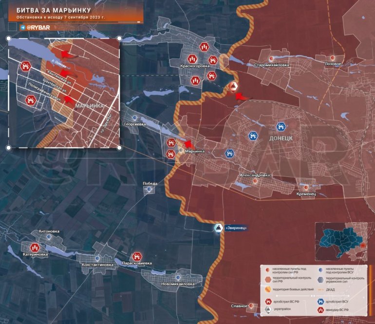Poslednjih nedelja, vojnici 150. divizije Oružanih snaga Rusije uspeli su da napreduju dublje među niske zgrade u Marjinki. Sudeći po snimcima na internetu ruske trupe su napredovale duž ulica Poligrafička, Kaštanova, Šahterska, kao i Ivana Franka u blizini reke Osikove, znatno dublje u odbranu VSU - nešto više od 300 metara do periferije.
