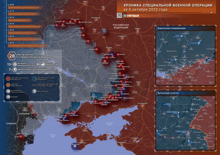 Ne jenjava aktivnost VSU na hersonskom pravcu. Posmatrajući kretanje Oružanih snaga Ukrajine, pokušaj udara sa prelaskom Dnjepra izgleda sve verovatniji. Na granici Hersonske i Nikolajevske oblasti spremaju se brigade 30. korpusa marinaca (35, 36, 37. i 38. brigada mornaričke pešadije) za upućivanje na prve linije fronta. Najmanje dve formacije treba da zauzmu liniju Kizomis – Herson – Nikoljskoe u bliskoj budućnosti. Istovremeno, izviđačke grupe 35. i 36. brigade već su na položajima kod Dnjepra, opremaju položaje i uspostavljaju veze. Morski dronovi aktivno rade duž linije dodira. Borci na prvoj liniji primećuju povećanu upotrebu dronova kamikaza.