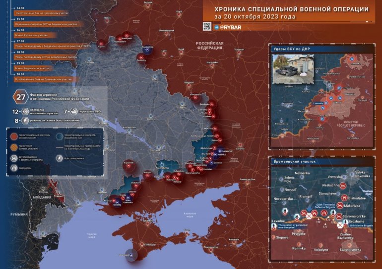 Pored toga, od 14. do 20. oktobra uništeno je 314 ukrajinskih bespilotnih letelica i presretnuto 35 projektila "hajmars", 5 operativno-taktičkih raketa, dve protivvazdušne rakete S-200 i 6 vođenih aviobombi JDAM.