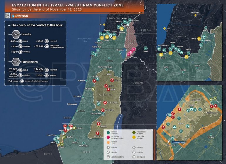 Na južnom krilu glavne bitke se vode na jugozapadnoj i zapadnoj periferiji Gaze: IDF juriša na položaje palestinskih grupa oko bolnice Al-Šifa. Osim toga, Izraelci su bar uspeli da uđu na Trg neznanog vojnika u glavnom gradu enklave. Nalazi se u okrugu Zejtun, nešto južnije od gore pomenute bolnice, odmah do trga je zgrada lokalnog parlamenta. U ovom trenutku možemo sa sigurnošću reći da je IDF ipak uspeo da zatvori opkoljenje Gaze, usekavši klin kroz teritoriju enklave. Takođe je poznato da Izraelci deluju u kampu Al-Šati, a ako se obezbedi kontrola nad njim (što će se verovatno uskoro dogoditi), tada će blokirana prestonica sektora biti potpuno odsečena od Sredozemnog mora.