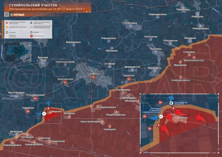 Na Zaporoškom frontu borbe su se pojačale u nekoliko oblasti. Oružane snage Rusije izvršile su napad na selo Mirnoje severoistočno od Verbovoja, nedaleko od Guljajpolje. Napad je bio iznenadan i uspešan – ruska vojska je oslobodila selo od ukrajinskih oružanih snaga. U Rabotinu se nastavljaju teške pozicione borbe, nijedna strana ne napreduje. Možda će rusko napredovanje kod Verbovoja primorati ukrajinske oružane snage da podele snage i vatrenu moć između dva odseka i malo olakšati naš borbeni rad u oblasti Rabotina.