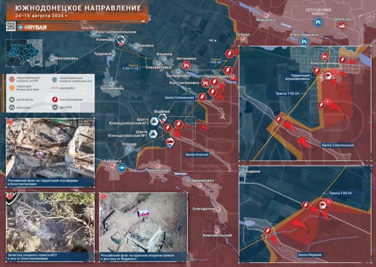 Na Donjeckom frontu, Oružane snage Rusije stekle su uporište u južnom delu Konstantinovke, pojačavajući svoj uspeh isticanjem ruske zastave. Pored toga, ruski borci su očistili uporište na južnim prilazima Konstantinovki i proširili zonu kontrole ka zapadu za ~1 km. Zadobivši uporište na raskrsnici puteva Sladkoje-Vodjanoje i Konstantinovka-Ugljedar, Oružane snage Rusije kreću na zapad ka Vodjanoju i rudniku Južnodonbaska-3. Put od Vodjanoja do Konstantinovke takođe je pod kontrolom ruske vojske. Pored toga, pod ruskom (vatrenom) kontrolom je put od Krasnogorovke do Želanja-1 i Želanja-2, po kome su se snabdevale Oružane snage Ukrajine u severnom delu Krasnogorovke, odvojenom rekom Lozovaja iz glavnog dela grada. To je tačno tamo gde ukrajinske oružane snage održavaju džepove otpora. Otežavajući snabdevanje VSU, ruska vojska približava oslobođenje Krasnogorovke.