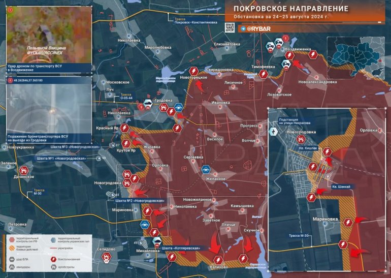 Na pravcu Pokrovskog, teške borbe se nastavljaju u Grodovki. U oblasti Orlovke, Oružane snage Rusije su isterale ukrajinske oružane snage iz uporišta za četu i napredovale u šumske pojaseve između Orlovke i Novogrodovke. Oružane snage Rusije preuzele su kontrolu nad polovinom Novogrodovke i kreću se ka zapadnoj i severozapadnoj periferiji grada. Prema operativnim podacima, ruske jedinice su uspostavile kontrolu nad železničkim mostom u zapadnom delu Novogrodovke. Sa raspoloživim snagama, VSU nije u stanju da zaustavi ili obuzda napredovanje ruske vojske u gradu u kome nema inžinjerijske odbrambene linije. Na jugu ruske trupe proširuju zonu kontrole na istok i jugoistok od Marinovke. Borbe se vode u blizini deponije rudnika Rusija (Kotljarevski). Od sadašnje linije fronta do istočne granice Selidova udaljenost je oko 3 km. Selidovo je potpuno bez struje i u toku je evakuacija. Oružane snage Rusije presekle su autoput Krasnoarmejsk (Pokrovsk)-Karlovka u blizini Nikolajevke, poremetivši logistiku garnizona Oružanih snaga Ukrajine u Karlovci. Ruske trupe su očistile mostobran površine 8 kvadratnih kilometara severozapadno od Kalinova, obilaze selo po bokovima i napreduju ka Karlovskoj magistrali. Da podsetim da su ruske jedinice juče već ušle u samu Karlovku sa istoka, potpuno ovladavši daćama ispred sela, a danas su otišli u pozadinu jedinica Oružanih snaga Ukrajine u rejonu rezervoara.