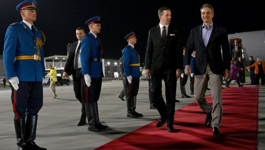 GRČKI premijer Kirijakos Micotakis doputovao je večeras u Beograd, a na aerodromu "Nikola Tesla" dočekao ga je šef srpske diplomatije Marko Đurić.