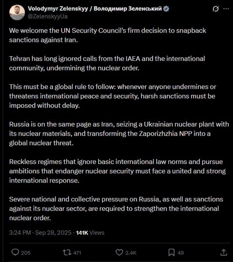 PREDSEDNIK Ukrajine Vladimir Zelenski pozdravio je odluku Saveta bezbednosti UN da ponovo uvede sankcije Iranu zbog njegovog nuklearnog programa.