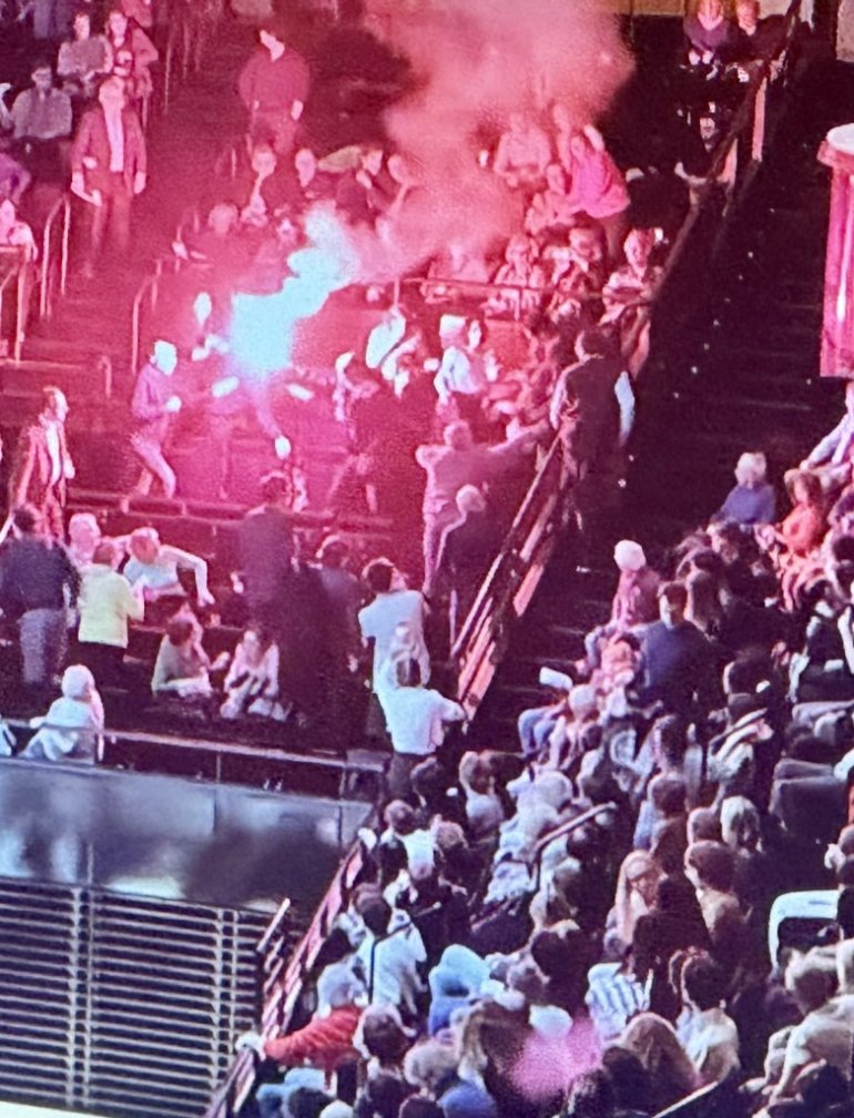 Nesvakidašnji incident dogodio se preksinoć prilikom koncerta izraelske filharmonije koji je prekdan tri puta. Upaljene su i baklje, umešala se i publika, a došlo je i do pesničenja.