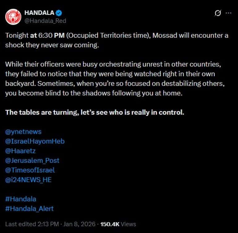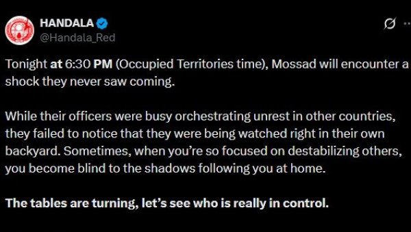 - Večeras u 18:30 (po vremenu okupiranih teritorija), Mosad će se susresti sa šokom koji nisu očekivali. Dok su njihovi oficiri bili zauzeti organizovanjem nemira u drugim zemljama, nisu primetili da su posmatrani pravo u svom dvorištu. Ponekad, kada ste toliko usredsređeni na destabilizaciju drugih, postajete slepi na senke koje vas prate kod kuće. Stolovi se okreću, hajde da vidimo ko zapravo kontroliše situaciju - navodi se u poruci.