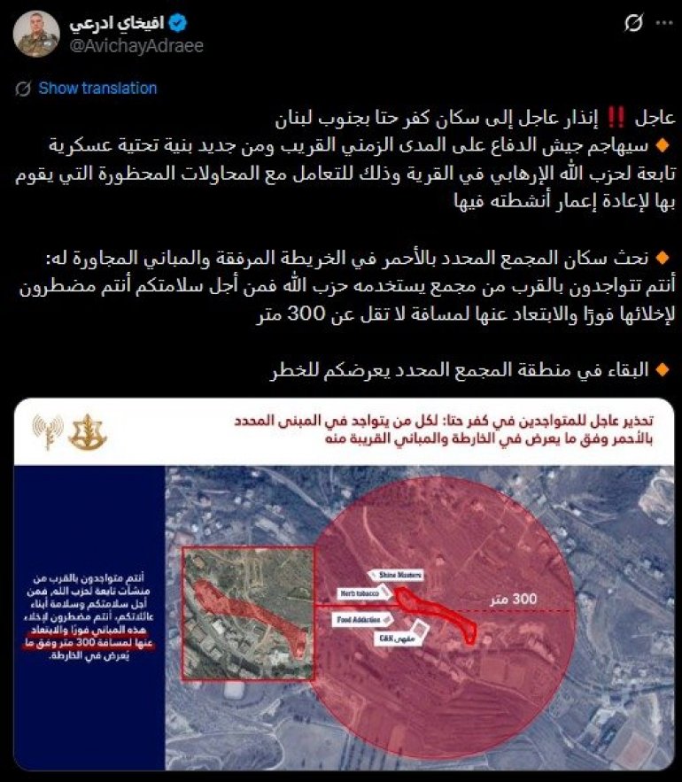 - Izraelska vojska će uskoro, ponovo, napadnuti vojnu infrastrukturu terorističkog Hezbolaha u selu, kako bi se obuzdali zabranjeni pokušaji obnove njihovih aktivnosti tamo - napisao je kolonijal Avićaj Adrai na X, uz mapu očekivanih ciljeva.