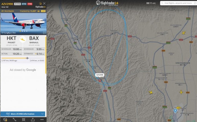 Kako se vidi na sajtu Flight Radar 24, avion trenutno kruži u blizini kineskog grada.