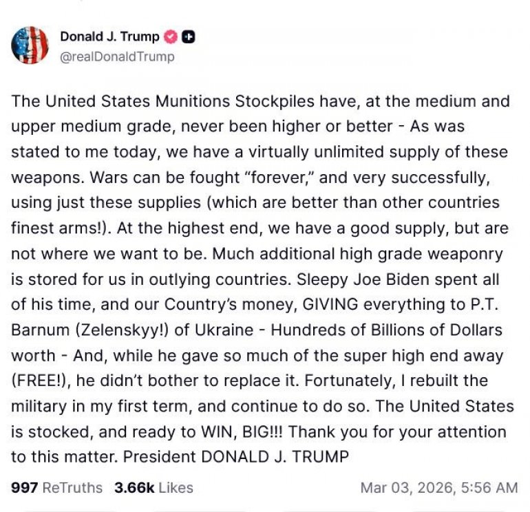 U Vašingtonu je prošla ponoć, ali Donald Tramp je objavio poruku na svojoj platformi Truth Social. Američki predsednik je rekao da SAD imaju rekordne zalihe municije srednjeg i višeg dometa.