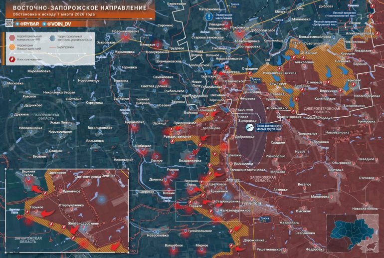 Ukrajinske formacije nastavljaju da ciljaju na zauzimanje Dnjepropetrovske oblasti, napredujući kod Vovče. Dalje na jug, ruske snage napreduju kod Guljajpolja. Ilustracija telegram rybar