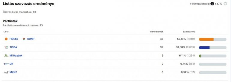 Na sajtu Nacionalne izborne kancelarije objavljeni su prvi brojevi, na osnovu kojih Fides-KDNP vodi na nacionalnoj listi sa 1,37 odsto glasova, Tisa stranka je druga, dok je Mi Hazank na trećem mestu, i dalje u konkurenciji.