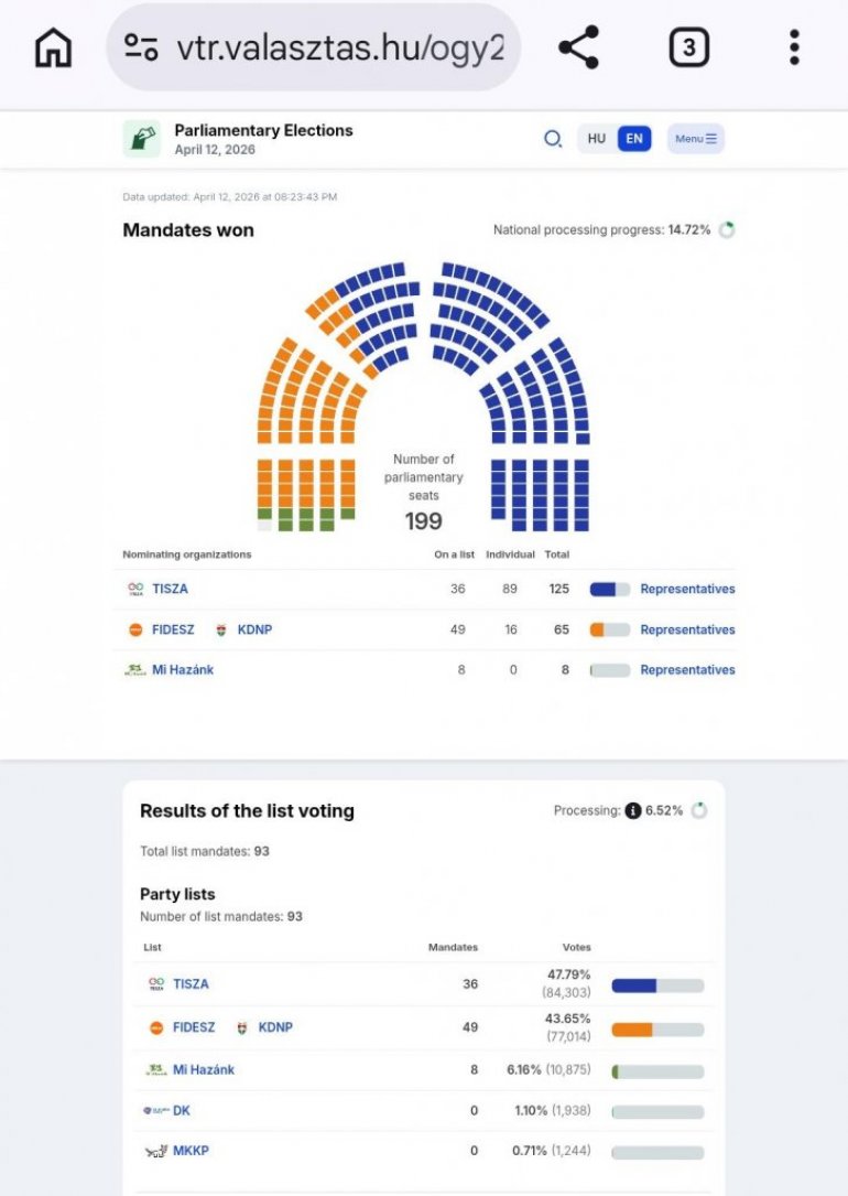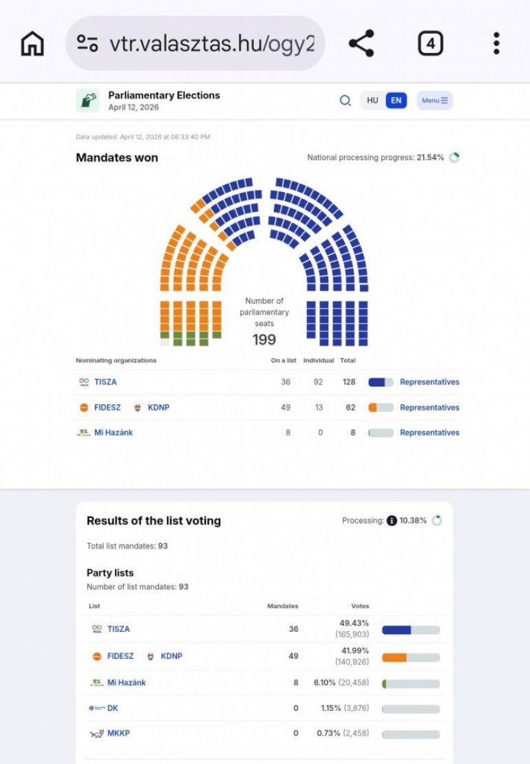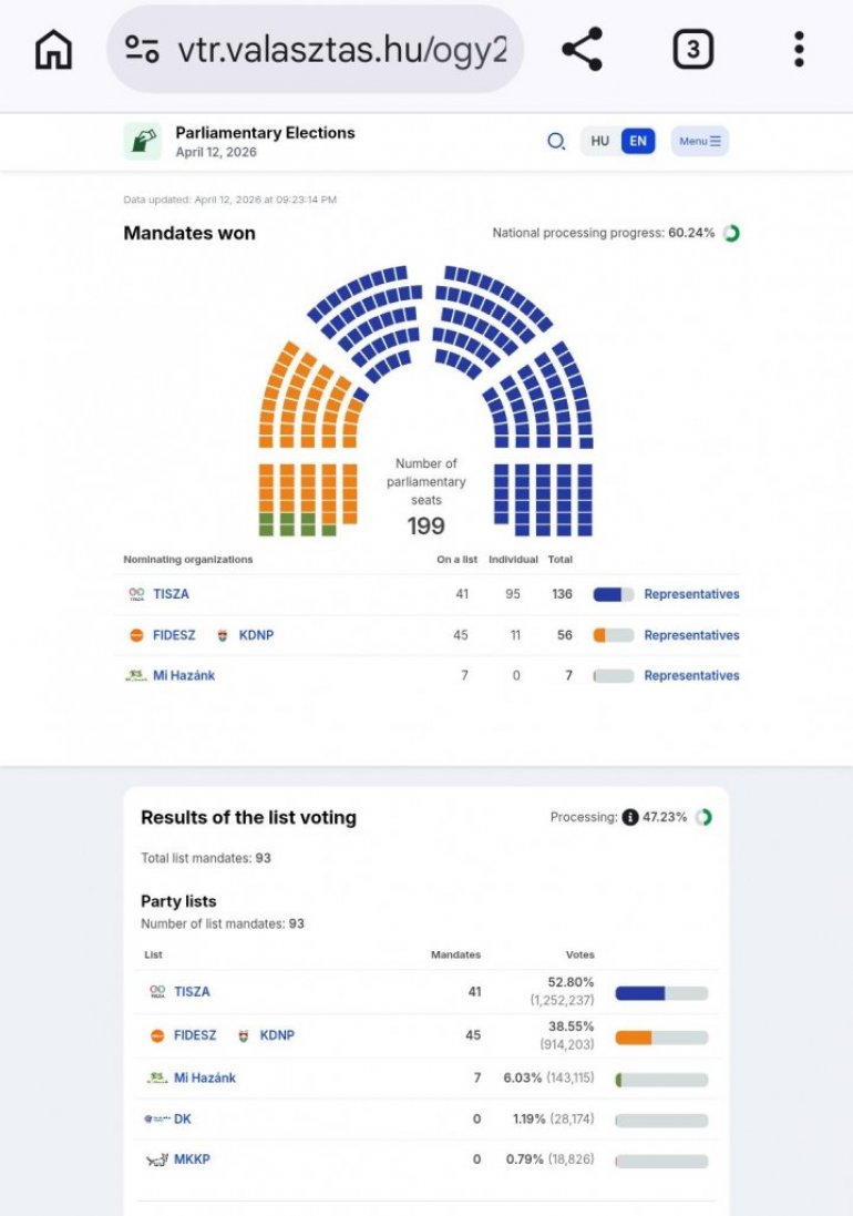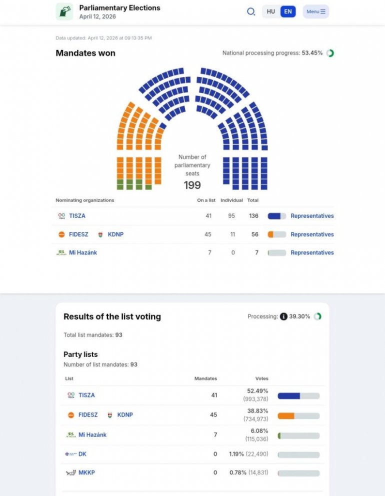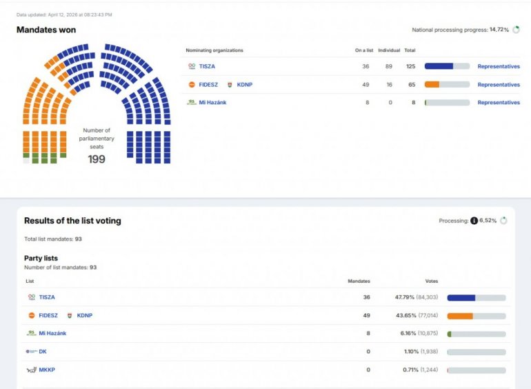 Na sajtu Nacionalne izborne kancelarije ažurirani su podaci, na osnovu kojih Tisa vodi na nacionalnoj listi sa 21,54 odsto glasova, Fides je drugi, dok je Mi Hazank na trećem mestu, ali je i dalje u konkurenciji. Prema delimičnim rezultatima, Tisa ima 49,43 odsto, Fides 41,99 odsto, a Mi Hazank 6,10 odsto. Demokratska koalicija znatno zaostaje, sa 1,15 odsto.
