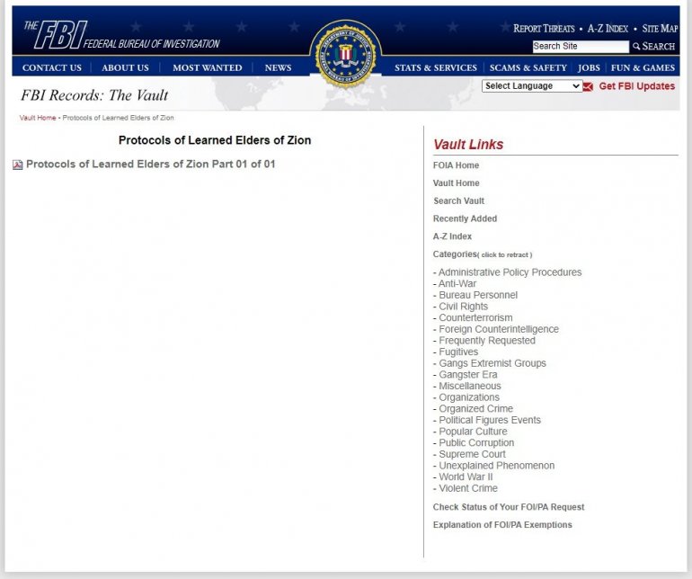 FBI je ovih dana objavio neobičan tvit u kom se našao kontroverzni dokument „Protokoli sionskih mudraca“ sa beleškama, ali bez ikakvog konteksta ili objašnjenja.